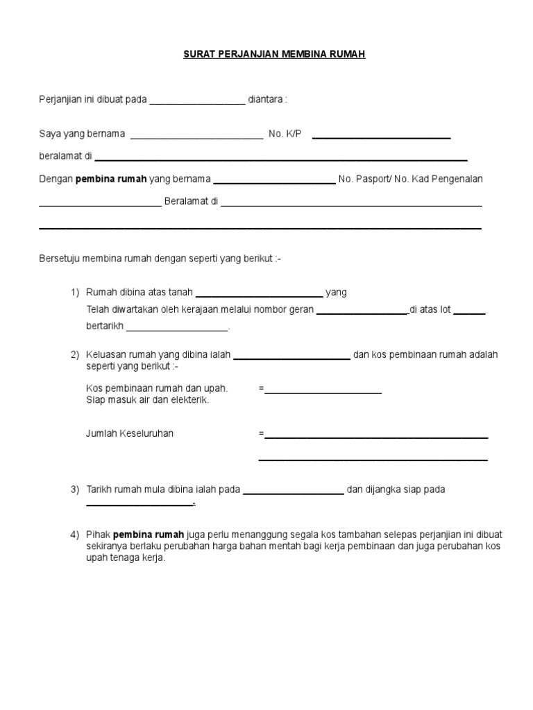 Contoh Surat Perjanjian Bina Rumah Save save contoh perjanjian kontrak bina rumah for later. PERJANJIAN BINA RUMAH KEDIAMAN Perjanjian dibuat pada _____ dengan termeterai perjanjian ini wang pendahuluan sebanyak RM500000 tunaidiberikan untuk membina rumah dan selebihnya akan dibayar ansuran sehingga selesai pembinaan rumah berharga RM3850000 seperti yang dipersetujui. Contoh Surat Akuan Sumpah Pembinaan Rumah Teluk jambe gang pesona rt 03 05 no.